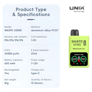 Unleash top-tier vaping with the WASPE 25000 PUFFS Dual Mesh Box. Enjoy customizable nicotine levels, a massive puff and e-liquid capacity, cutting-edge coil technology, an LCD screen, and fast Type-C charging for an unmatched vaping experience.
