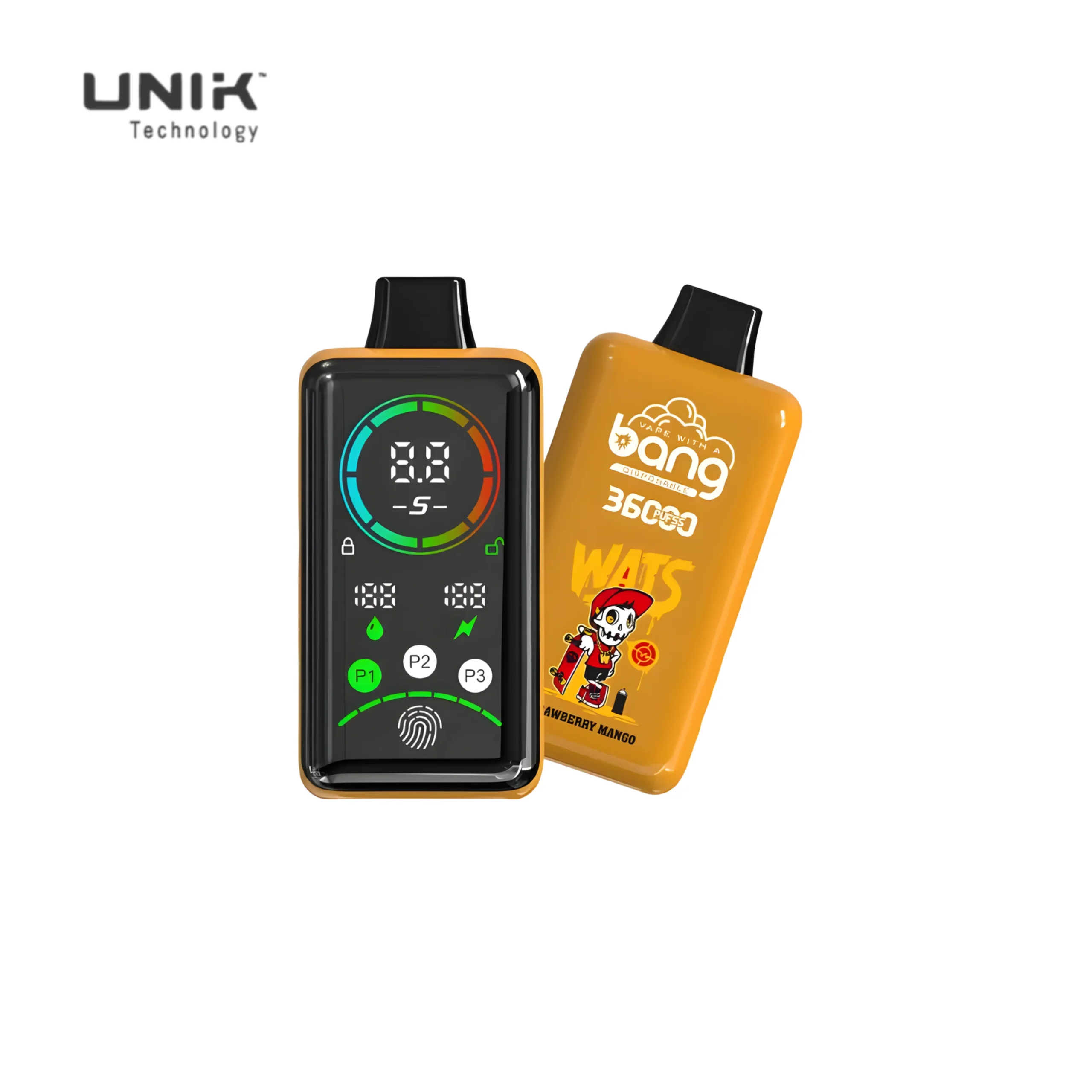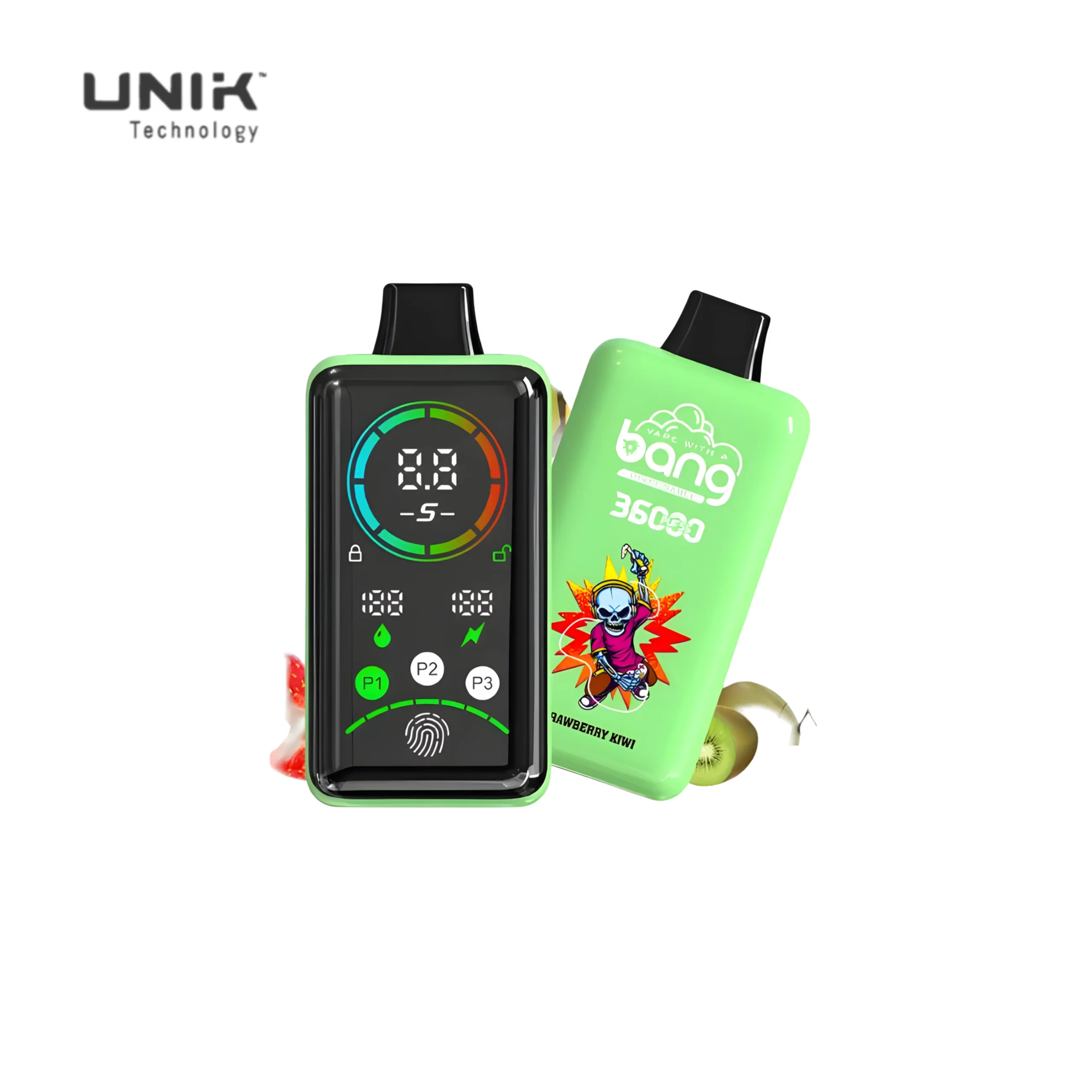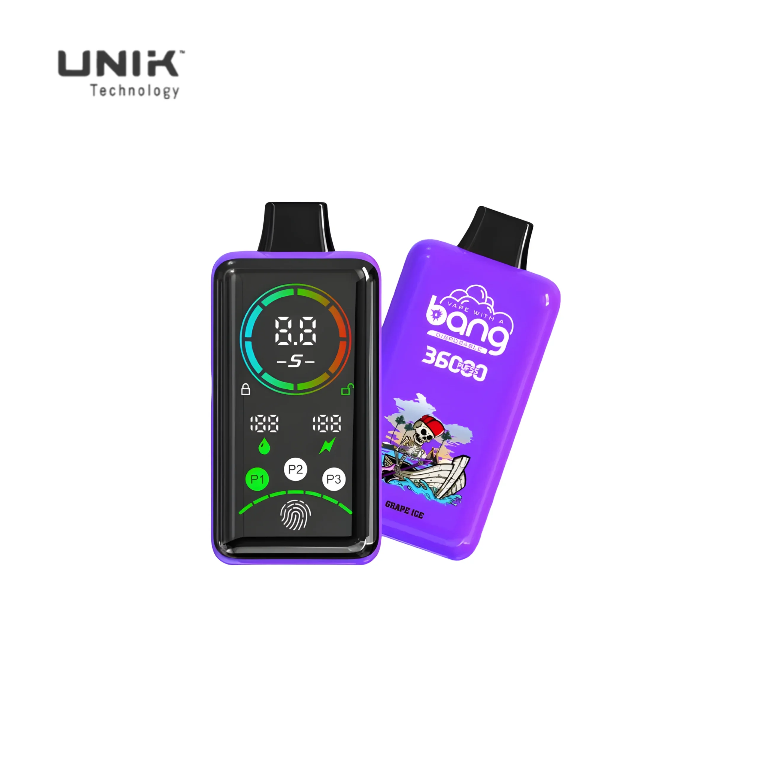Bang 36000 Puffs Smart Full Screen Vape by UNIK Vape: 36,000 puffs, 36ml e-liquid, 850mAh rechargeable battery, 12 flavors, dual mesh coil, smart screen display, and fingerprint regulation. Wholesale ready!